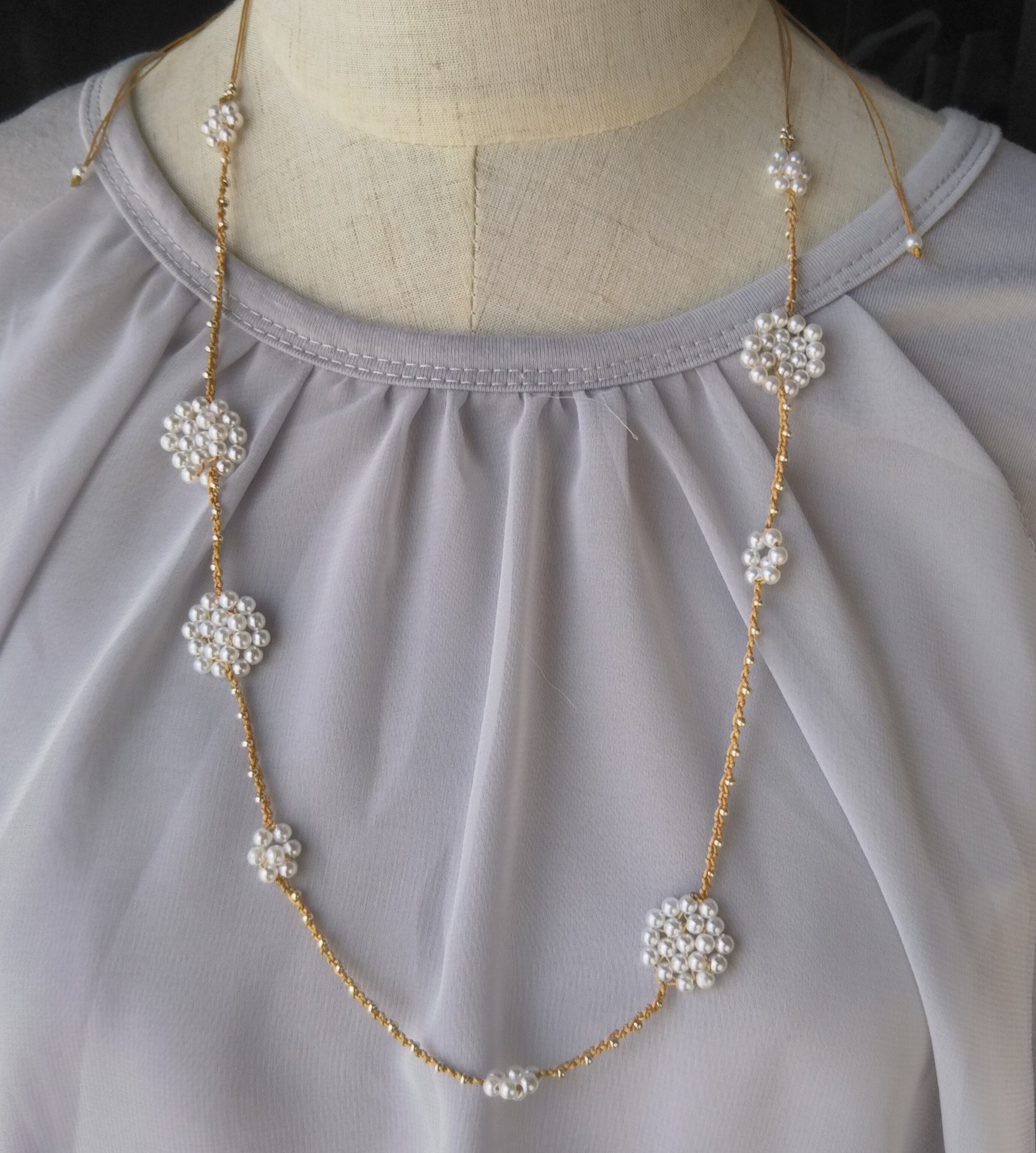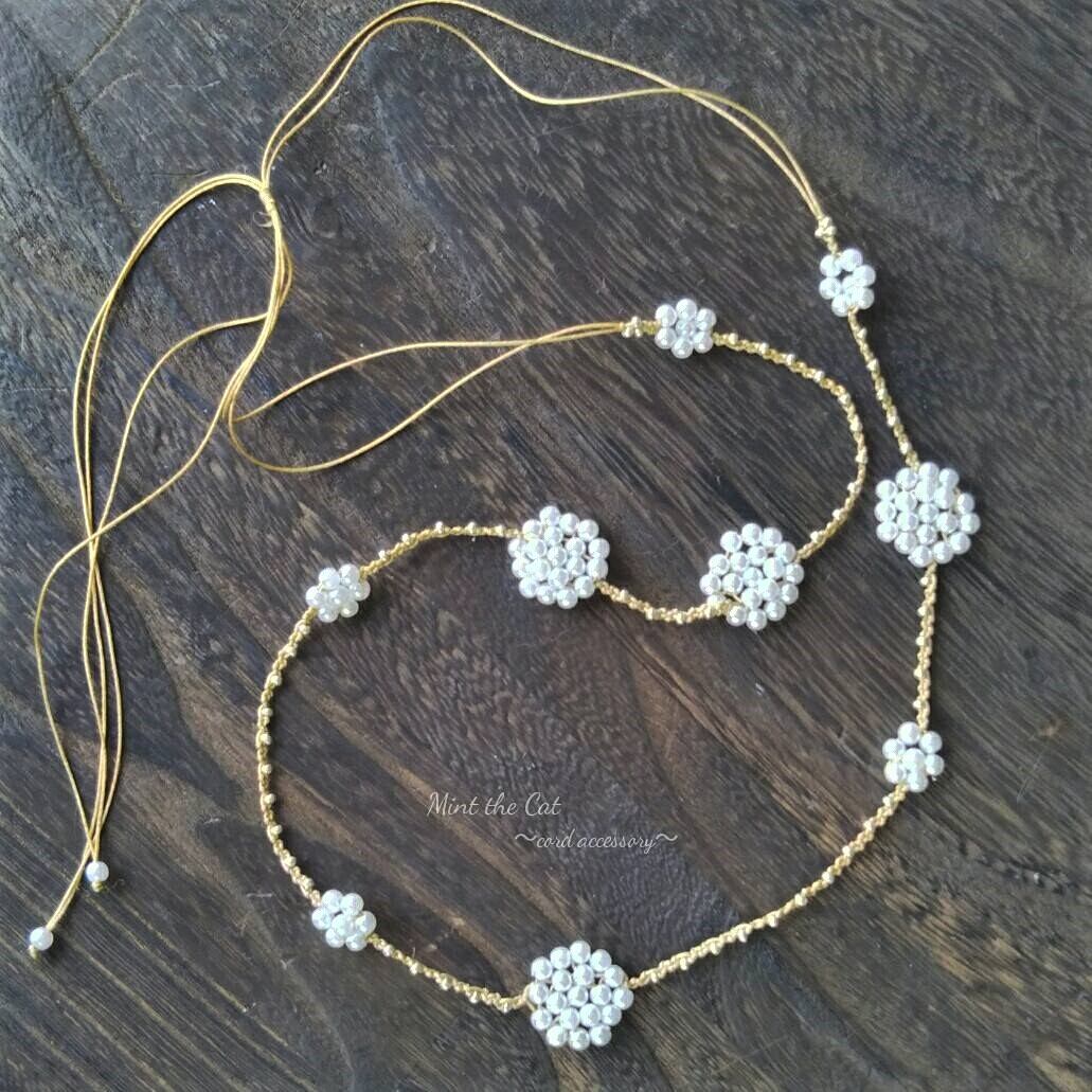 アジアンコード(中国紐)で作成したコードネックレスです。パールとメタルパーツを編みこんだデザインとなっております。パールをつないでお花のようにちりばめてみました。