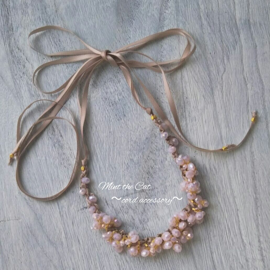 アジアンコード(中国紐)で作成したコードネックレスです。二重丸カンにアジアンコードでビーズを編み、さらにリボンで編んだデザインとなっております。紐を引いて、長さの調整ができます。